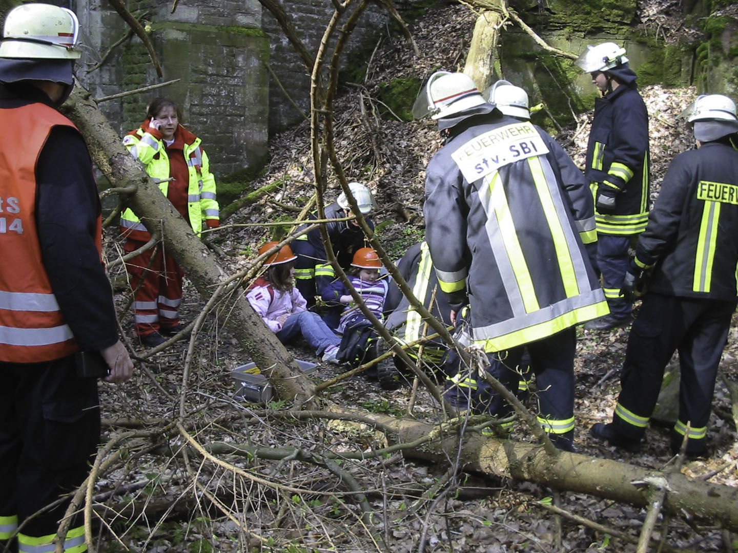 Nachdem ein Rettungshund zwei Kinder am ehemaligen Bahntunnel bei Deisel gefunden hatte, übernahm die Feuerwehr Helmarshausen die Rettung der beiden Mädchen.