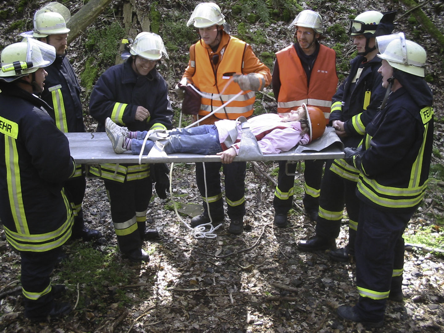 Zum Glück nur eine Übung - da kann man auch einmal lachen: Vier Feuerwehrleute halten die Trage empor, ein Kamerad "schnürt das Päckchen" fachmännisch ein, damit die Verletzte beim Transport durchs Gelände nicht von der Trage rutschen kann.