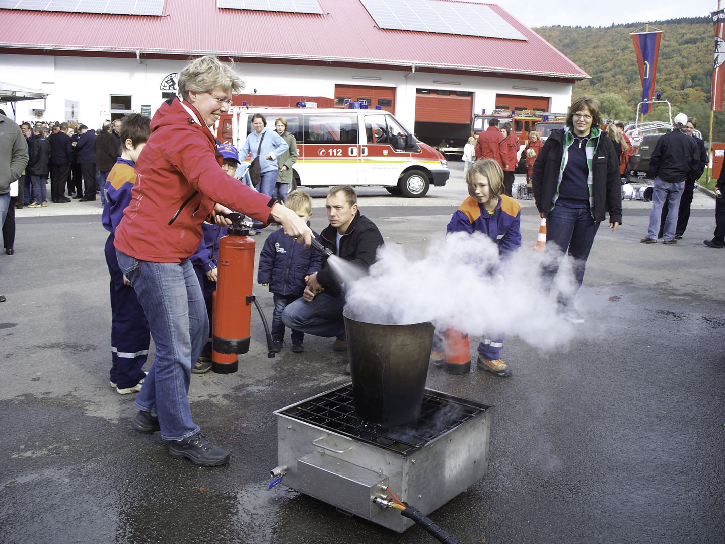 Einige hundert Besucher kamen zum Tag der offenen Tür des neuen Gerätehauses. Die Feuerwehr Helmarshausen bot ein buntes Programm. Hier konnte jeder einmal selbst den Umgang mit dem Feuerlöscher ausprobieren.