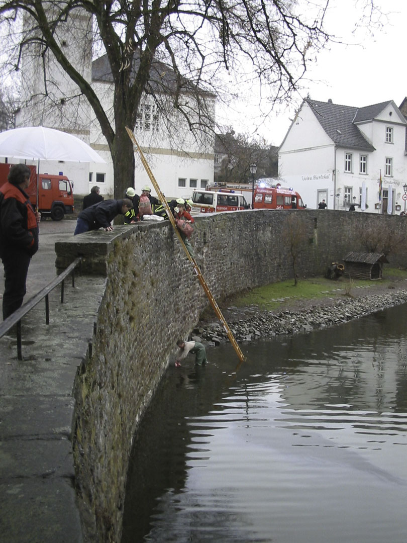 Zwei Kameraden aus Bad Karlshafen, ausgerüstet mit Wathosen, stigen über eine Steckleiter in das Hafenbecken, um den Regenwasserzulauf zu schließen.