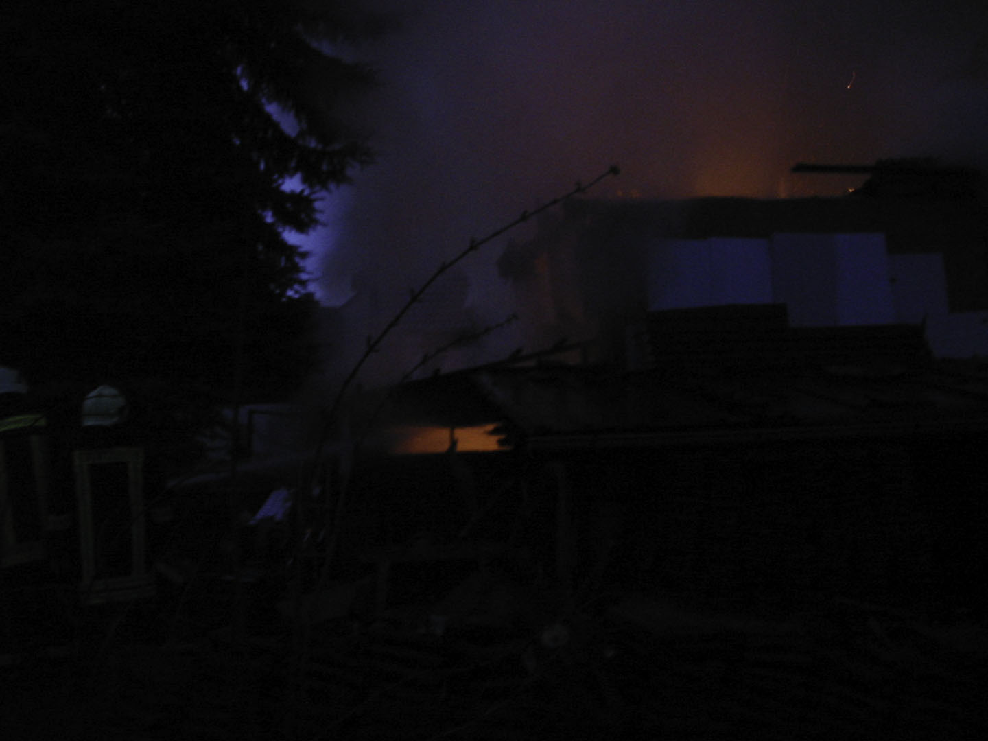 Blick von der Seite: Auf der Rückseite ist das Holzhaus komplett durchgebrannt, die Rückwand teilweise eingestürzt.