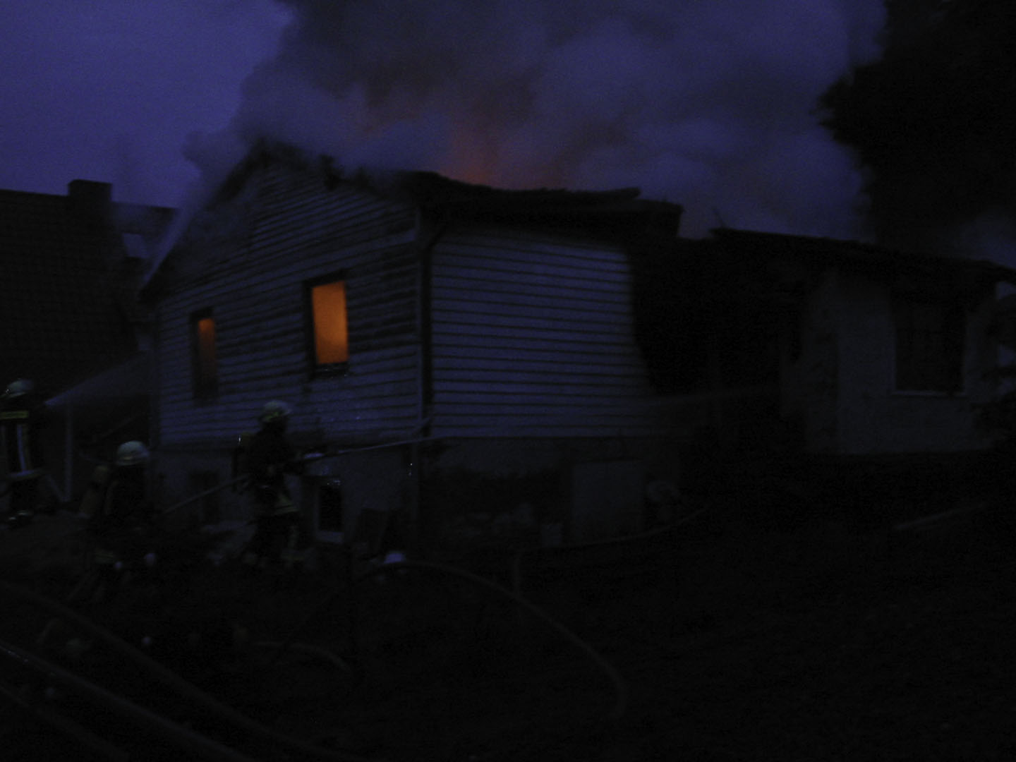 Durch Dach und Fenster sind Flamen zu sehen.