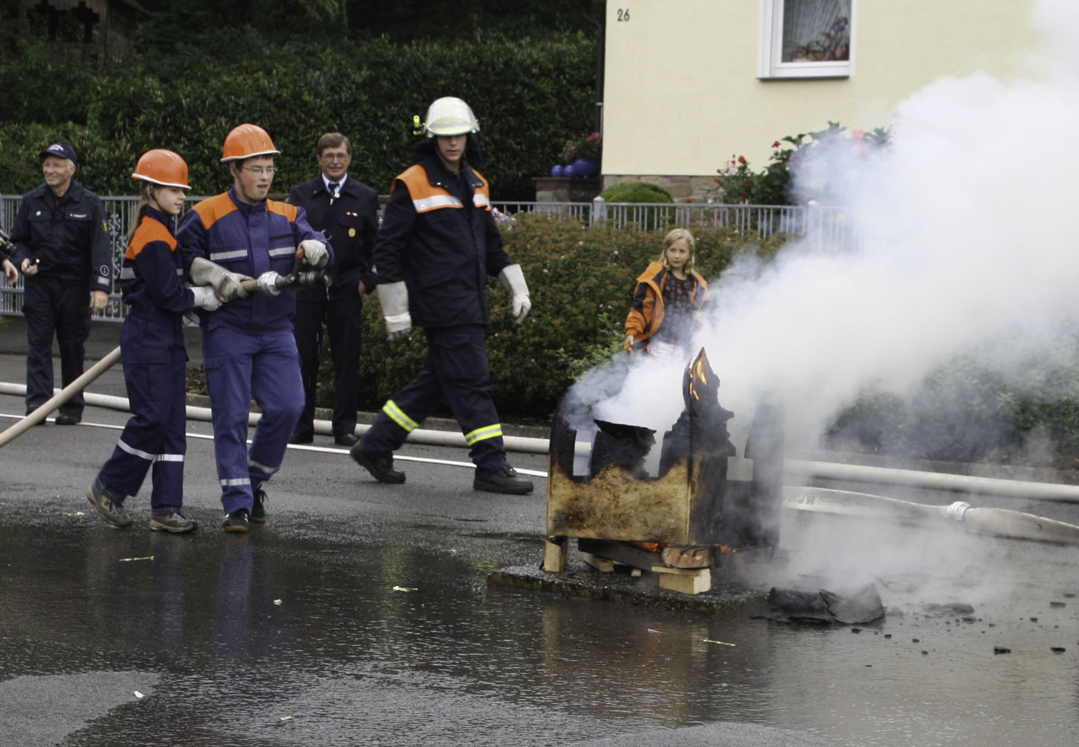 "Gebäudebrand in der Niederau" - Zu diesem Alarmstichwort zeigte die Jugendfeuerwehr Helmarshausen, dass sich die Helmarshäuser Bevölkerung um den Brandschutz auch in Zukunft keine Sorgen machen braucht. Im Vordergrund v.l.n.r: Julie Meder und Niklas Eckermanns, stv. Stadtjugendwart Jan Seela; im Hintergrund Vereinsvorsitzender Wolfgang Becher.